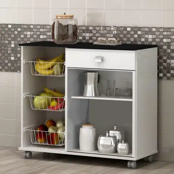 A Fruteira Isis é um móvel versátil e funcional projetado para armazenar e organizar frutas, legumes e outros alimentos frescos. A fruteira possui duas portas que se abrem para revelar um amplo espaço interno.Além das portas, possui uma gaveta ideal para armazenar itens menores, como talheres, guardanapos ou pequenos utensílios de cozinha. Possui três cestos metálicos que são projetados para armazenar frutas e legumes de maneira organizada.